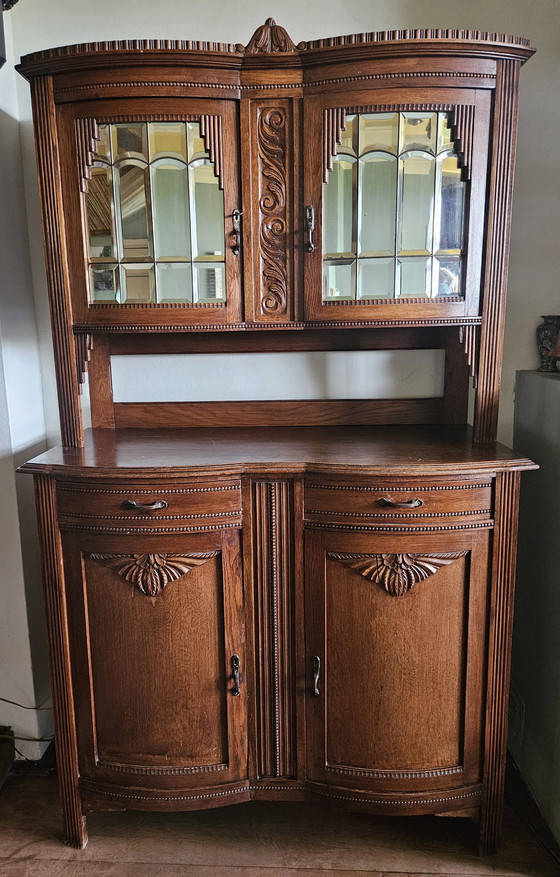 Este aparador antiguo francés es un mueble impresionante, fabricado en madera de alta calidad y equipado con cristal de espejo pulido. Con tallas detalladas.