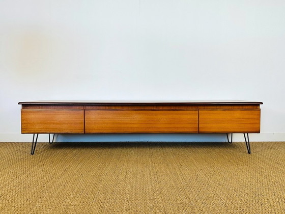 Aparador bajo escandinavo de teca con patas de horquilla, 1960.