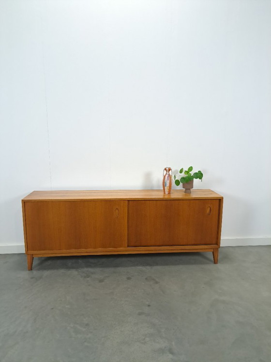 Aparador vintage de chapa de nogal. El gabinete viene de Alemania alrededor de 1950 y fue publicado por WK Möbel de Georg Satink. El armario tiene un diseño elegante y dos grandes puertas correderas con un estante. El estante se puede regular en altura. La altura hace que el aparador sea bueno para utilizarlo como mueble de TV.