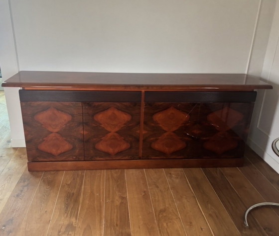 Este impresionante aparador de mediados de siglo presenta una excepcional chapa de nogal con vetas de un hermoso patrón simétrico (bookmatched). La superficie superior de alto brillo realza el movimiento natural de la madera, otorgándole una presencia sofisticada y casi escultural.