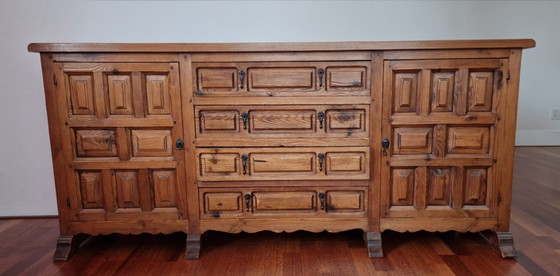 Aparador de roble español macizo. 42 cm de fondo, 175 cm de ancho y 80 cm de alto. El aparador cuenta con cuatro cajones centrales y dos puertas. Los cajones y las puertas tienen herrajes metálicos. La llave de las puertas aún se conserva. El aparador data de finales de la década de 1960.
