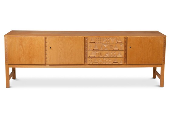 Aparador de roble y chapado de roble con 3 puertas y 4 cajones de madera tallada. Estantes en el interior. Llave.