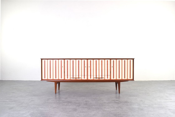 Este aparador de teca se fabricó en Noruega en la década de 1960. La pieza ha sido restaurada profesional y cuidadosamente, eliminando los revestimientos antiguos, tiñéndola y barnizándola. La restauración fue realizada por un carpintero talentoso y experimentado con más de 20 años de experiencia. Gracias a estos tratamientos, el aparador luce magnífico y servirá a su nuevo propietario durante muchos años sin temor a sufrir daños ni desgaste por el uso diario. Se incluyen dos llaves.