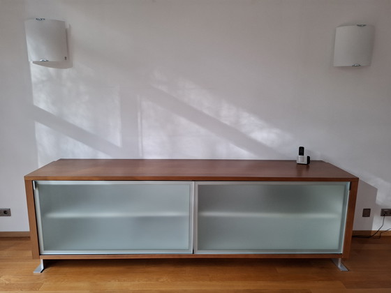Este aparador de madera de cerezo con puertas correderas de cristal grabado se ha rebajado profesionalmente 10 cm (a juego con la blenda) para alojar un sistema de sonido. Por ello, también se han perforado orificios para los cables en el interior. El exterior presenta algunas señales de desgaste (ver fotos). La puerta corredera no se desliza con suavidad. Nota: La oferta finaliza el 25 de marzo de 2025.