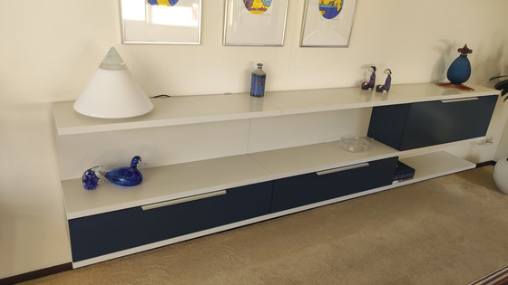 Aparador grande Interlubke de pared en blanco brillante y azul grisáceo.