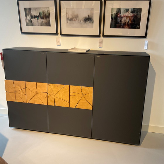 Aparador Hartmann Cuore. Precioso mueble de cristal antracita con paneles de roble. Tiene dos grandes puertas batientes con dos compartimentos. En el lateral izquierdo también cuenta con dos compartimentos y un cajón. La puerta inferior derecha presenta un desperfecto (ver foto).