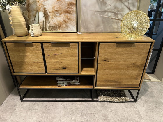 Aparador City de Henders & Hazel: 190 cm. Cuenta con tres puertas y tres nichos (con iluminación LED), de la colección Henders & Hazel. Acabado en chapa de roble marrón ferrocarril y metal pintado de negro.