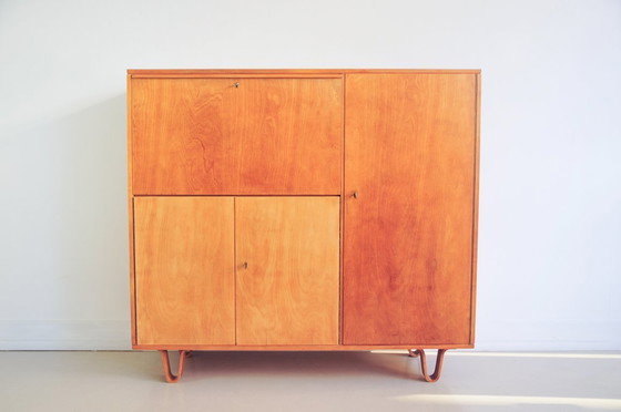 Un aparador Pastoe CB01 vintage con sección administrativa/secretaria y patas de bucle, parte de la serie Birch. Este mueble vintage data de la década de 1950 y cuenta con hermosas patas de bucle (contrachapado curvado). El mueble presenta signos de desgaste en la parte superior. Ha tenido un solo propietario.
