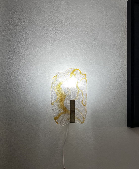 Aplique con una hermosa pantalla arqueada de cristal de Murano, con un patrón y una composición únicos. Solo un aplique. Las formas abstractas de vidrio ámbar contrastan a la perfección con el fondo de vidrio esmerilado texturizado. Los soportes presentan pequeñas astillas e imperfecciones. Ver fotos. Dimensiones totales: 24,5 x 17 x 11 cm. Pátina por el uso y el paso del tiempo. Cableado recién recableado. Aplique de un solo casquillo. El aplique puede presentar un ligero desgaste debido al uso y al paso del tiempo. Se envía sin bombilla.