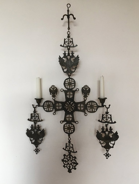Hermoso candelabro de pared con una cruz bizantina. En la parte superior y en ambos brazos se encuentra un águila bicéfala, símbolo del Imperio Romano de Oriente o Imperio Bizantino.