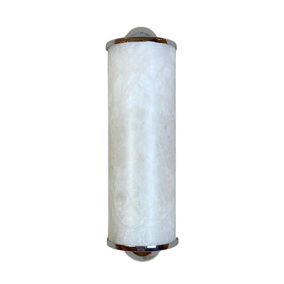Aplique de pared vintage elaborado en alabastro natural y metal cromado, con un refinado diseño semicilíndrico. El alabastro difunde una luz cálida y suave, perfecta para crear un ambiente acogedor.