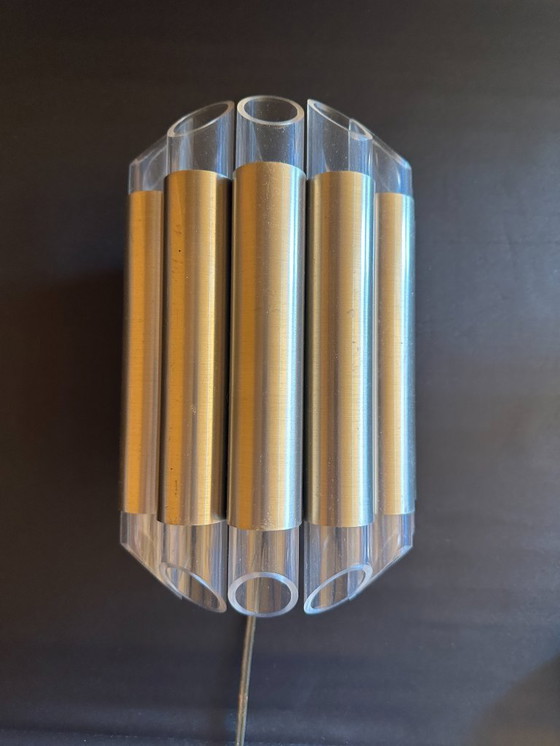 Aplique de diseño excepcional de la prestigiosa marca holandesa Raak Amsterdam, modelo 'Septiem', diseñado en la década de 1970. Esta lámpara escultural consta de siete cilindros de aluminio cepillado, colocados en semicírculo, con plexiglás biselado en la parte superior e inferior.