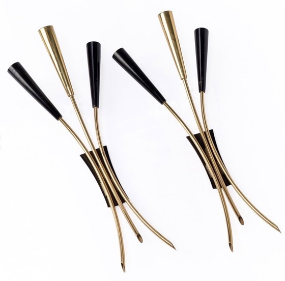 Ilumine su espacio con la elegancia del diseño italiano de mediados de siglo con estos exquisitos apliques de la década de 1960. Elaborados con una armoniosa combinación de tonos negros y dorados, estos apliques encarnan la sofisticación y el estilo de la época.