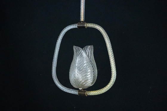 Lámpara colgante de cristal de Murano, diseñada por Ercole Barovier y fabricada en Italia durante la década de 1940. Un refinado ejemplo de la artesanía de Murano de mediados de siglo, esta lámpara presenta una pantalla escultórica de cristal soplado con forma de tulipán, rodeada por una elegante estructura de cristal con bucles, ambas elaboradas en cristal de Murano transparente texturizado. El pie y el florón exhiben el mismo intrincado patrón acanalado, característico de la obra de Barovier de la época. Los herrajes de latón aportan calidez y complementan la suave translucidez del cristal. Completamente original y en excelente estado vintage, sin desconchones ni grietas.