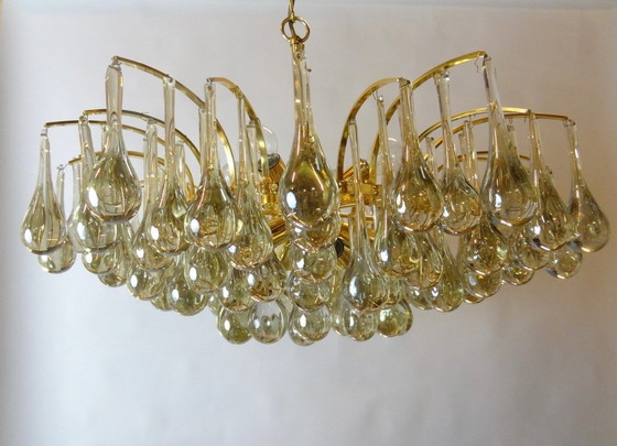 Esta exquisita lámpara Palwa de los años setenta es un impresionante ejemplo de diseño de iluminación vintage. Su elegante forma está adornada con numerosas gotas de cristal que captan y reflejan la luz maravillosamente, creando un espectáculo fascinante.