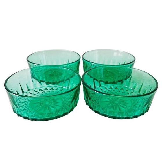 Precioso juego de 4 cuencos de vidrio prensado Arcoroc France de color verde esmeralda.