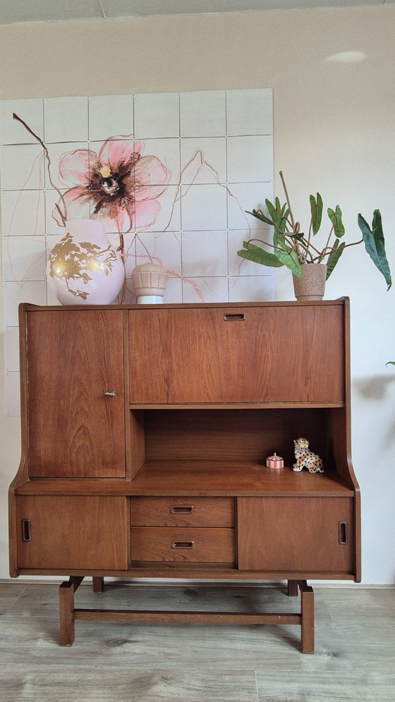 ¡Precioso aparador alto de diseño danés! Ofrece un amplio espacio de almacenamiento y un práctico cajón con tapa. Cuenta con dos cajones pequeños y dos puertas correderas en la parte inferior, todas con tiradores de madera. En el lateral derecho, dispone de un gran compartimento con cerradura. El aparador se apoya sobre una base única que le confiere un aspecto elegante.