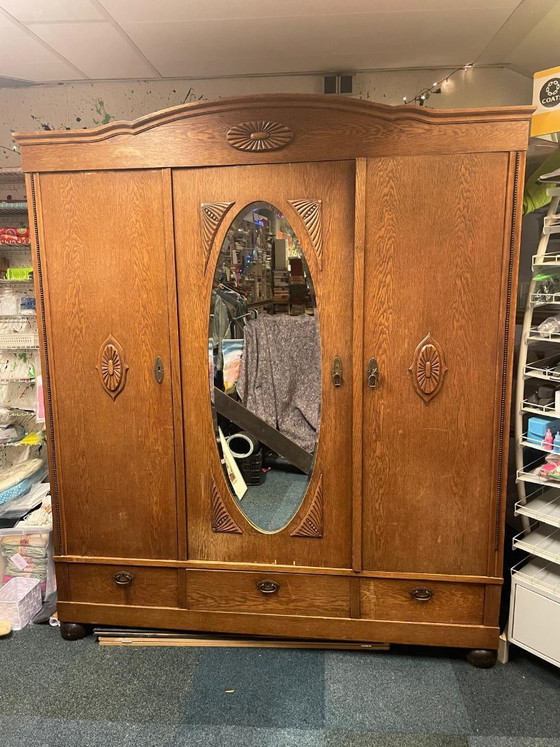 Este precioso armario antiguo de tres puertas con espejo y cajones es un mueble atemporal que combina elegancia y funcionalidad. La cálida madera marrón y los detalles refinados lo convierten en el centro de atención de cualquier dormitorio. El armario ofrece un amplio espacio de almacenamiento gracias a su espacioso interior y sus prácticos cajones inferiores. La puerta central cuenta con un gran espejo, ideal para comprobar tu atuendo.