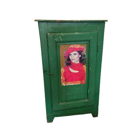 Antiguo armario de roble francés de principios del siglo XX. El armario es de roble macizo y tiene un acabado pintado de verde y marrón desgastado. Lo que hace especial a este armario son los detalles: hay carteles antiguos originales pegados tanto en el exterior como en el interior de la puerta. Los estantes se han renovado. En la parte inferior hay algunos agujeros de carcoma antiguos, pero ya no están activos.