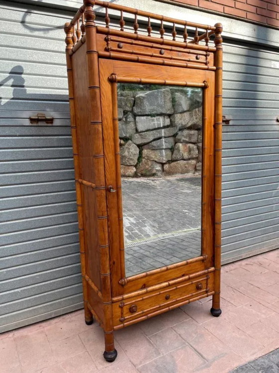 Armario francés de imitación de bambú del siglo XIX, hecho de pinotea con detalles de imitación de bambú de haya maciza. La puerta de espejo se abre a un interior con tres estantes ajustables. Un cajón bajo la puerta. Enl a parte trasera hay dos etiquetas originales del ebanisteria de Montpellie. Estructula firme, con algunos reparaciones no sgnioficativos.