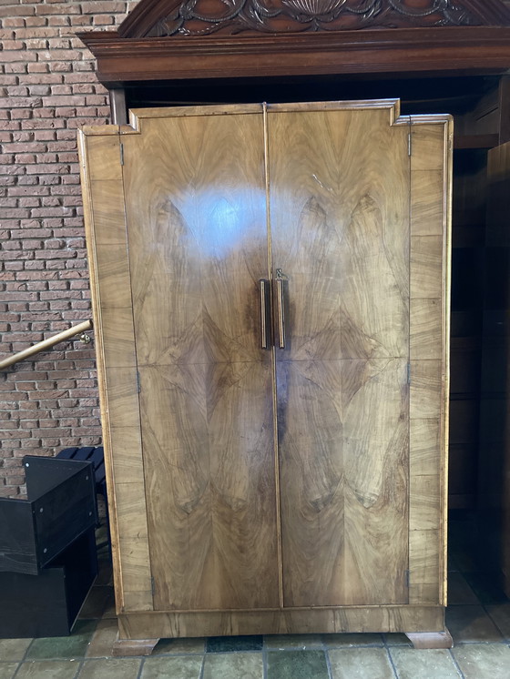 Precioso armario antiguo. Creo que la chapa es de madera de nogal. La chapa es de espejo en las puertas, lo que se llama chapa de libro. Se ve bien con el otro gabinete del otro anuncio. Ha tenido una vida sin embargo, por lo que no sin daños. Ponemos en un sistema autónomo con estantes, por lo que es un armario de almacenamiento excelente.