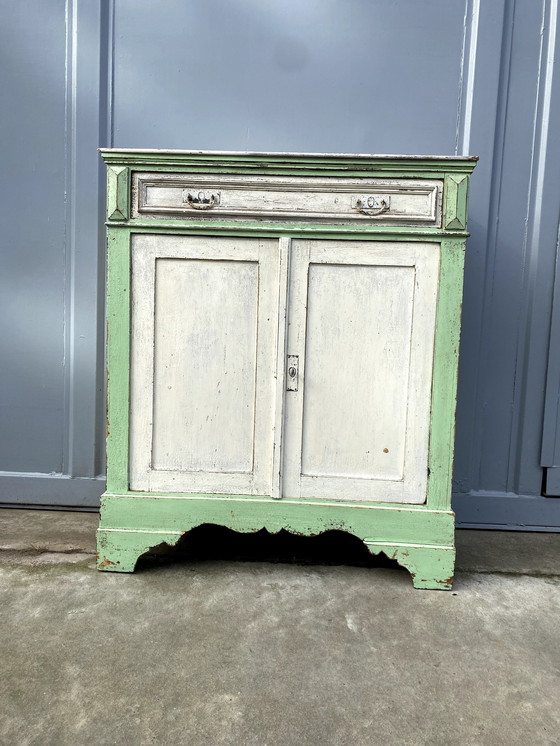 Armario antiguo para niña en blanco y verde. Cuenta con un cajón. La sección inferior tiene dos puertas con dos estantes en el interior. Bellamente desgastado por el paso del tiempo. Largo: 95 cm, Ancho: 43 cm, Alto: 111,5 cm.