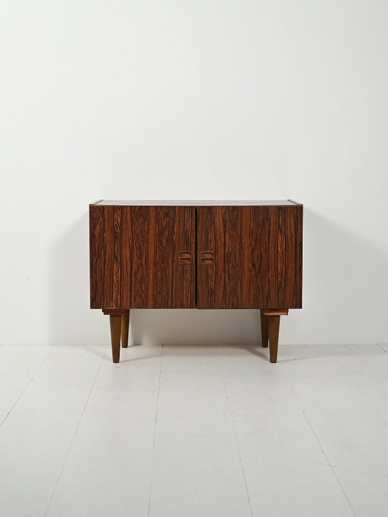 Armario danés de los años 50-60 en laminado efecto palisandro con puertas abatibles, tiradores empotrados esculpidos y patas cónicas. Incluye la etiqueta original de Denka.