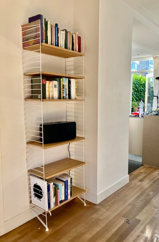Este armario String es un clásico del diseño, ligero y elegante. Es de String Furniture y es nuevo (no vintage). Esta versión cuenta con montantes blancos y seis estantes de roble, y se puede colocar contra la pared.
