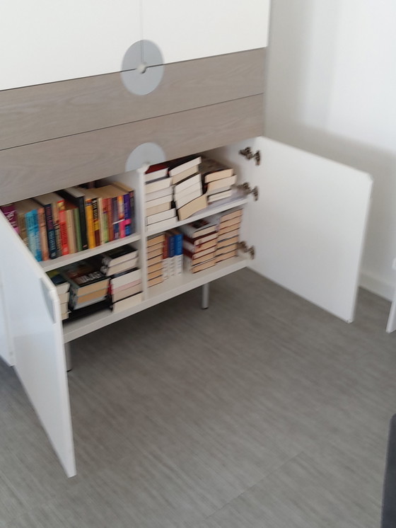 Este atractivo mueble de pared consta de dos armarios superiores, cada uno con dos estantes, y dos armarios inferiores, cada uno con un estante. Estos estantes permiten personalizarlos. Entre los armarios superiores e inferiores se encuentran dos cajones de ancho completo, cada uno con acabado de veta de madera gris/marrón claro. Los frentes y cajones de los armarios presentan incrustaciones de aluminio que forman dos círculos decorativos y también sirven como tiradores.
