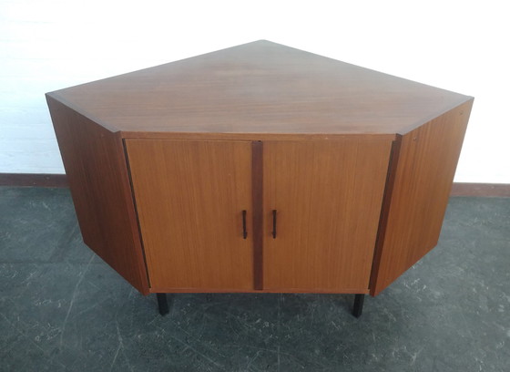 Armario esquinero vintage de mediados de siglo de la década de 1960, en chapa de madera de teca con patas de metal negro .