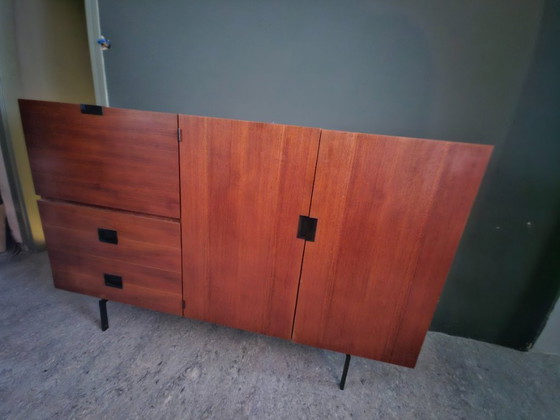 De la serie japonesa U+N. 1958. Teca. Diseño Braakman. Puertas dobles con estantes, una puerta abatible, cuatro cajones.