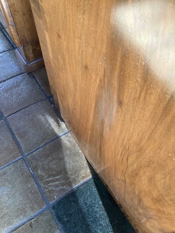 Precioso armario antiguo. Creo que la chapa es de madera de nogal. Tiene espejos en las puertas, lo que se llama chapa de libro. Se ve bien con el otro gabinete del otro anuncio. Ha tenido una vida sin embargo, por lo que no sin daños. Pusimos en un sistema independiente con estantes, por lo que es un excelente armario de almacenamiento.