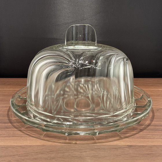 Esta quesera o mantequera Art Déco es de vidrio prensado, con un bello e intrincado diseño típico del estilo Art Déco. El cristal transparente permite ver el queso o la mantequilla.