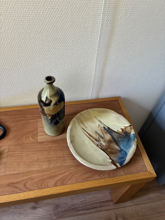 Este hermoso juego de cerámica pintado a mano incluye una botella y un plato, ambos con un diseño único y artístico. La combinación de beige, azul y marrón crea una apariencia elegante y atemporal. Perfecto para la decoración del hogar o como un regalo con estilo.