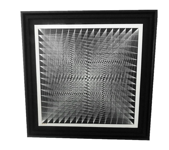 Radios Diagonales - Lucille Roebuck Keeler - Litografía - EE. UU. - 1965 - Firmada, fechada y enmarcada - 28 cm x 28 cm (sin marco) - 30 cm x 30 cm (con marco) - Ejemplar de artista sin numerar de 230 ediciones, más 65 ejemplares fuera de circulación sin numerar. Editorial Panderma, Basilea. 1965. Una edición limitada excepcional de la colección "La Lune en Rodage". Colección reunida por Carl Laslzo, que incluía a los artistas más destacados de la época, como Enrico Castellani, Piero Manzoni... Recién enmarcada según las reglas del arte, en junco cuadrado negro mate y Marie-Louise. Lucile Keeler [1902-1996] Artista estadounidense nacida en Chicago. Se graduó de la Universidad Northwestern, Evanston, Illinois. En la década de 1930, estudió en el Instituto de Arte de Chicago con el paisajista y retratista Francis Chapin. En 1935, se mudó a una casa con un amplio estudio en la parte trasera, construido para su trabajo. Allí creó todas sus obras, especialmente sus litografías. Su obra se expuso en galerías de toda el área de Chicago. En 1990, se mudó a Phoenix, donde murió en 1996. Su trabajo se enmarca dentro del movimiento Op Art como Agam, Bury, Calder, Eggeling, Kovalski, Kusama, Ray, Richter, Rodtchenko, Soto, Tinguely, Varini, Vasarely, Yvaral… • Descripción: Op Art - Pop Art - Arte cinético • Artista: Lucille Roebuck Keeler • Título de la obra: Radius-Diagonal • Fecha: 1965 • Técnica: Litografía • Firma: Firmada a mano, fechada • Editorial: : La Lune en Rodage (230 ex.) • Edición: Copia del artista sin numerar • Marco: Sí, con Marie-Louise • Estado: Muy bueno • Dimensiones: 28 cm x 28 cm