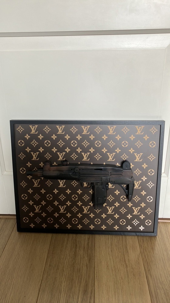 Objeto de arte especial moderno con uzi y obra de arte de Louis Vuitton. Arte Daluxe de 2023. Madera con vinilo. Dim 50/40/4. Con certificado de autenticidad.