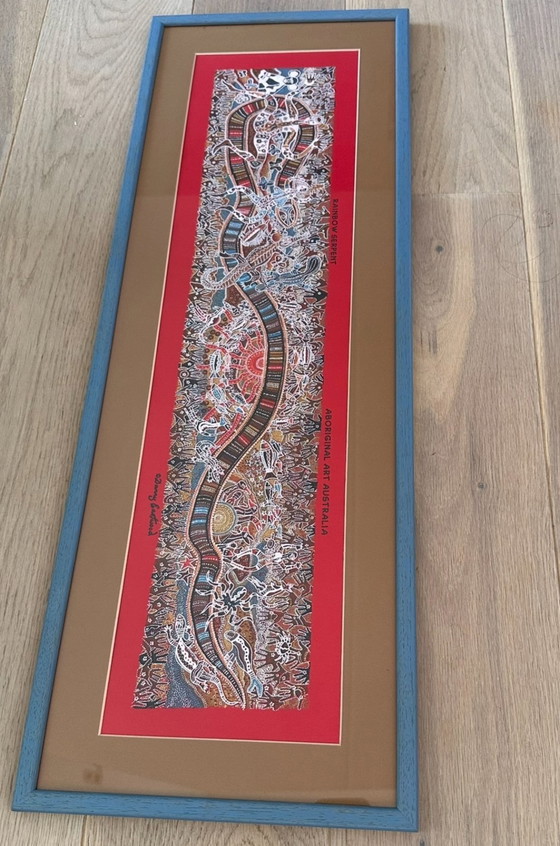 Esta es una hermosa obra enmarcada de Danny Eastwood, conocido por su arte aborigen. La obra es versátil y puede colgarse horizontal o verticalmente. El marco es robusto y añade una dimensión extra a la obra. La obra está en excelentes condiciones y es una valiosa adición a cualquier colección de arte.