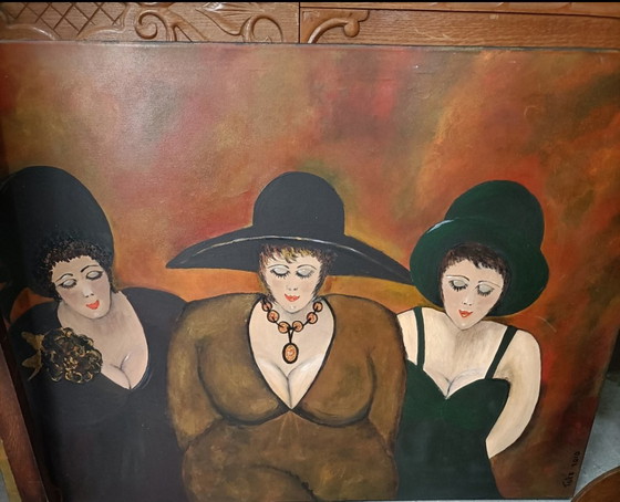 Esta pintura original sobre lienzo, firmada por Tuke en 2010, representa expresivas figuras femeninas en tonos cálidos. La obra está realizada en un estilo expresionista moderno con influencias del arte naïf. La composición y el uso del color la convierten en una pieza llamativa para cualquier colección de arte. Una esquina está ligeramente dañada y podría retocarse fácilmente o colocarse dentro de un marco o bastidor.