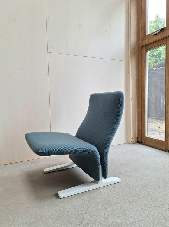 La Artifort Concorde F780 es una icónica silla de diseño, diseñada por Pierre Paulin en 1966. Inspirada en el avión supersónico Concorde, esta silla irradia elegancia y un estilo atemporal. Está tapizada en una hermosa tela acanalada en un suave tono azul verdoso con un patrón de rayas diagonales. Las robustas patas de acero son blancas, creando un hermoso contraste con la tapicería. Esta silla se encuentra en excelente estado vintage y es el complemento perfecto para cualquier interior que busque añadir un toque de diseño clásico.
