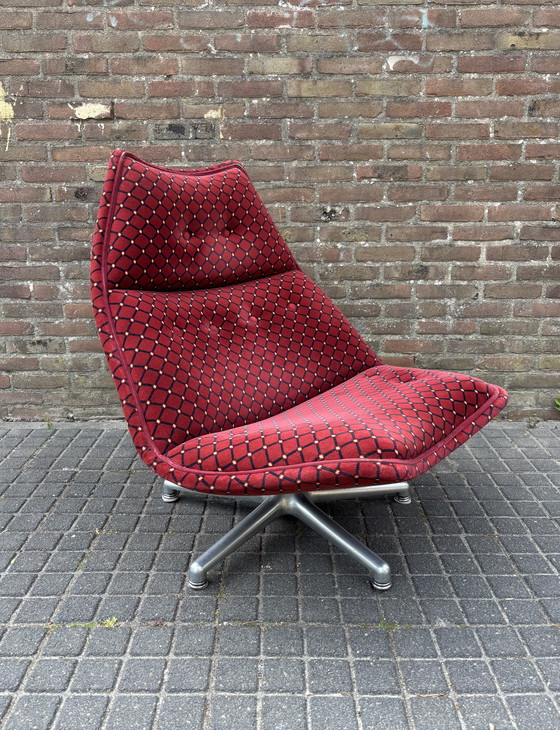 Este sillón Artifort Serie F500 (probablemente F512) presenta una llamativa tapicería textil con estampados en rojo y negro, complementada con una robusta base metálica en forma de estrella. Su diseño es un ejemplo clásico del estilo moderno de mediados de siglo, ofreciendo comodidad y atractivo estético. Es perfecto para añadir un toque de elegancia vintage a cualquier espacio. Presenta solo un ligero desgaste, como se muestra en las imágenes; faltan algunos botones.