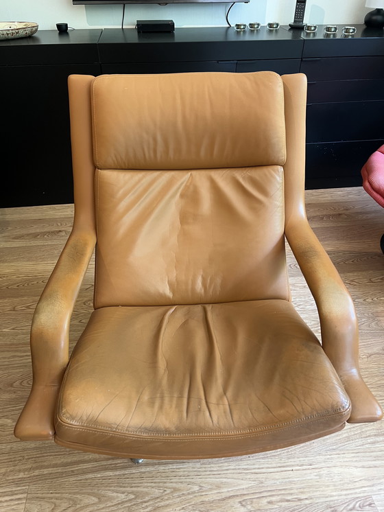 Atrifort Geoffrey Harcourt F140 en buen estado, de 1974. La tapicería de cuero y la espuma se cambiaron hace 10 años. El cuero está en general en buen estado, con algunas pequeñas grietas en los reposabrazos. Por lo demás, presenta signos de desgaste propios de la antigüedad de la tapicería.