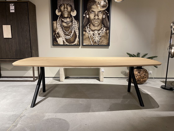 - Mesa de comedor ovalada Xooon Arvada. - Material: Roble macizo, lacado natural. - Base: Metal negro. - Dimensiones: An. 110 x Pr. 250 x Al. 77 cm.