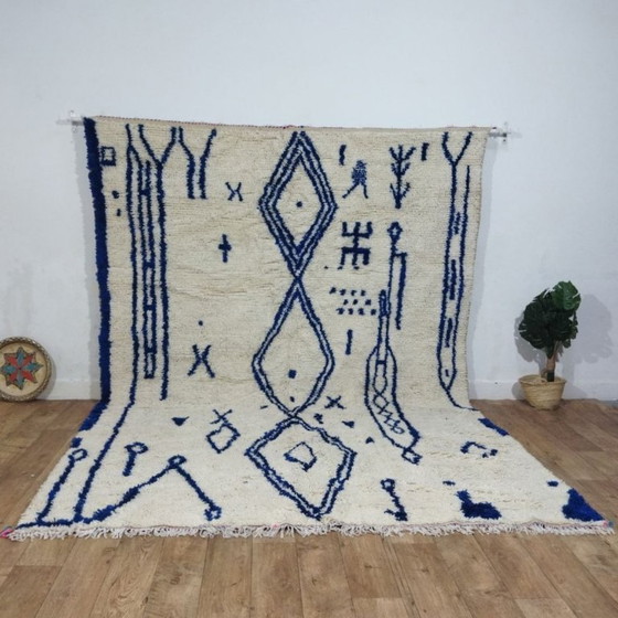 Auténtica alfombra bereber marroquí de lana natural, elaborada a mano en Marruecos. Esta pieza grande y excepcional presenta un elegante fondo marfil decorado con motivos azul marino de inspiración amazigh y formas geométricas simbólicas, creando una refinada composición artística llena de carácter y tradición.