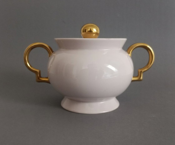 Azucarero con tapa «Barbara» de Gio Ponti, estilo Art Déco/Bauhaus, rosa y dorado, década de 1930. 20 x 12 cm. En perfecto estado, con marca. Curiosamente, Ponti diseñó originalmente el juego para Ginori cuando era director artístico de la empresa, pero Johann Haviland se hizo cargo del diseño y lo fabricó; fueron los únicos en producir esta versión rosa y dorada, la más codiciada. Pieza rara. Envío en la UE: 35 €. Envío internacional: 55 €.