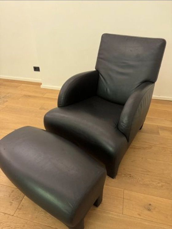 Se vende un exclusivo sillón de diseño del fabricante italiano B&B Italia - modelo Oriente, diseñado por Antonio Citterio. El sillón está completamente tapizado en piel auténtica negra de alta calidad e impresiona por su forma suave y redondeada y su elegante aspecto vintage.