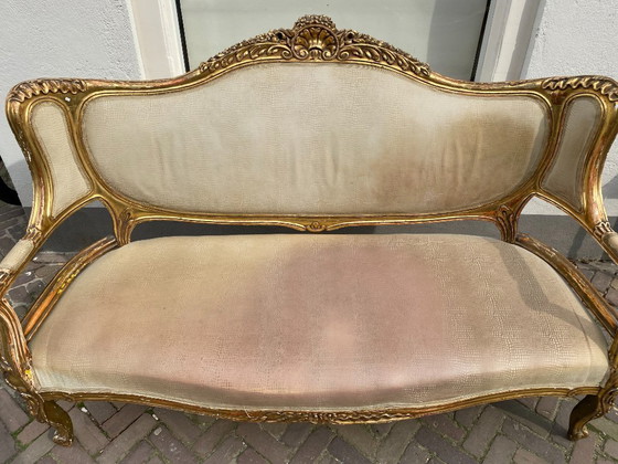 CondiciónBienColoresOro, BeigeMaterialMadera, TextilNúmero de artículos1Altura110 cmAnchura170 cmProfundidad65 cmAltura del asiento45 cmSignos de usoDecoloración, Arañazos