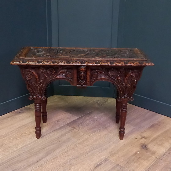 El frente está decorado con un bello motivo floral y una cabeza acuchillada en el centro, lo que le confiere un carácter especial.