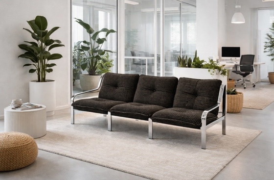 Este exquisito banco cromado de mediados de siglo es un testimonio de diseño y funcionalidad atemporales. Su elegante estructura cromada irradia una elegancia sofisticada, que se complementa a la perfección con los lujosos asientos de lana a cuadros marrones y beige. Ideal tanto para interiores modernos como clásicos, perfecto para oficinas, restaurantes y cafeterías.