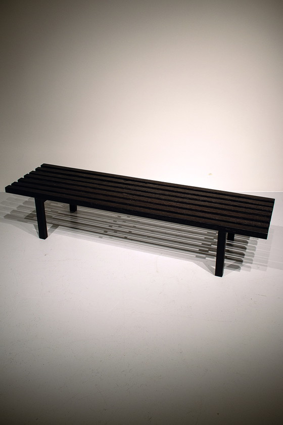 Banco de listones de mediados de siglo pintado de marrón oscuro (casi negro). Una pieza decorativa que puede usarse como macetero, mesa auxiliar o mesa de centro. En buen estado vintage.