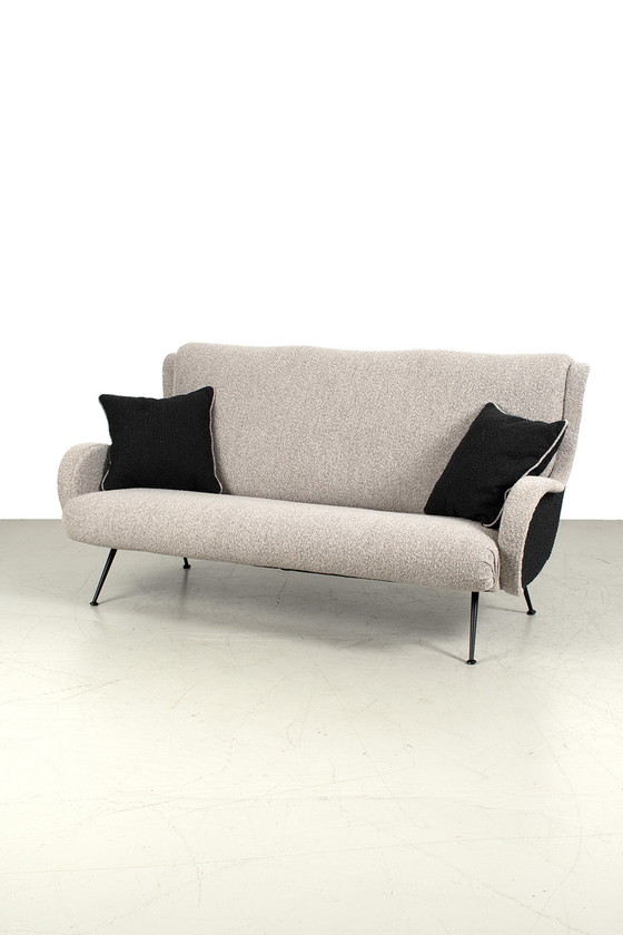 Este magnífico sofá de los años 50 ha sido completamente retapizado en tela bouclé negra y beige. Incluye dos cojines a juego de la misma tela. Se encuentra en buen estado. Medidas: L. 174 cm; Al. 90 cm; Pr. 88 cm; A. 36 cm.